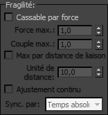 - Lorsque cette option est activée, les autres paramètres de fragilité sont disponibles et permettent de spécifier les conditions dans lesquelles les liaisons peuvent être rompues. Pour une cassure naturelle, apparemment aléatoire, les deux paramètres les plus importants sont Force max et Couple max.