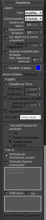 Remarque : La liaison est une propriété persistante de la particule ; la particule conserve donc sa liaison dans l'événement suivant. De plus, la propriété qui détermine la manière dont les liaisons peuvent rompre (définie par les paramètres Force max et Couple max) est conservée. Si des forces suffisantes sont appliquées à la particule dans l'événement suivant, la liaison peut être rompue. Toutefois, l'ajustement continu (voir ci-dessus) ne s'applique plus à la particule dans l'événement suivant : la particule conserve les valeurs Force max/Couple max qu'elle avait au moment où elle quitte l'événement en cours.