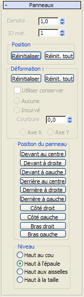 Ces boutons déplacent le groupe de fonctions sélectionné vers une position définie. Ces positions sont déterminées par 3ds Max à partir de celles définies par les commandes Spécifier des points sur le personnage du niveau objet Générateur de vêtements. Ces positions sont: