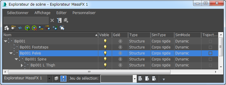 L'explorateur MassFX est une version spécialisée de https://beehive.autodesk.com/community/service/rest/cloudhelp/resource/cloudhelpchannel/guidcrossbook/jsonp?v=2021&p=3DSMAX&l=FRA&accessmode=live&guid=GUID-2569461E-C859-4D54-BAFF-C8BD078B53AC l'explorateur de scènes dédiée à l'utilisation des simulations MassFX. Il vous permet d'afficher les propriétés de simulation de tous les objets de la simulation. Vous pouvez également modifier des propriétés telles que le type des corps rigides et indiquer si les corps doivent faire partie de la simulation.