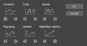Cette boîte de dialogue présente diverses options permettant de poursuivre une partie de l'animation en dehors de l'intervalle de clés que vous venez de créer. Chaque option est représentée par un bouton graphique. Dans le graphique, l'animation d'origine est représentée par une trace solide et l'effet de la poursuite de l'animation, par des traces en pointillé.