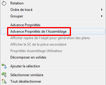 - Sélectionnez un élément de l'assemblage, cliquez avec le bouton droit de la souris et choisissez Advance Propriétés de l'Assemblage dans le menu contextuel.
