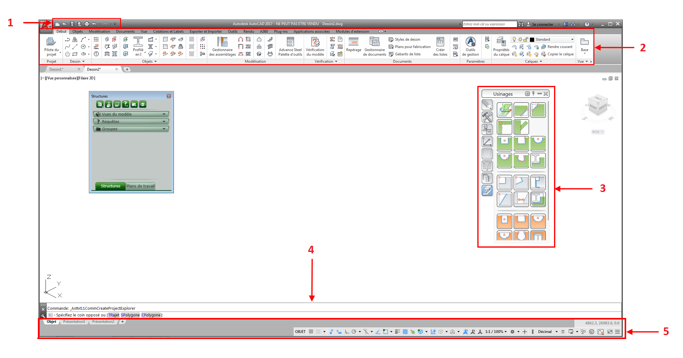 Affiche des informations concernant l'état du programme au cours des différentes phases du projet. Elle permet également d'accéder à la configuration de certains paramètres : les modes d'accrochage, le contenu des info-bulles d'objet, le système de coordonnées courant et les unités de travail.