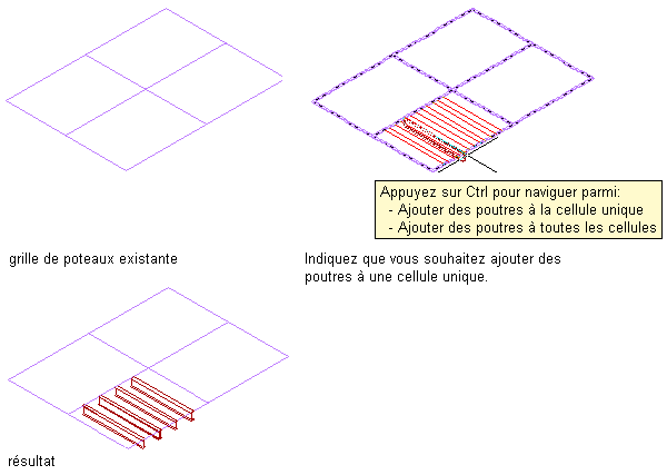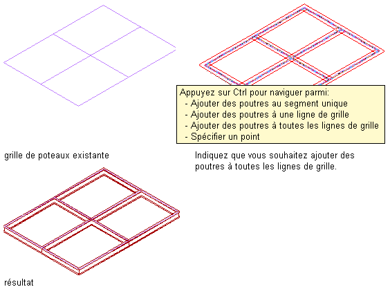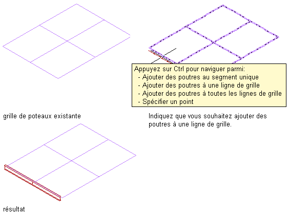 | ajouter une poutre le long d'un ou plusieurs segments d'une grille de poteaux (lorsque le type de positionnement correspond à Bord) | déplacez le pointeur sur un segment de la grille afin d'afficher un aperçu de la poutre, puis cliquez pour ajouter une poutre le long de ce segment ou appuyez sur la touche Ctrl et cliquez pour ajouter des poutres le long de tous les segments de cette ligne de grille ou appuyez sur la touche Ctrl à deux reprises pour ajouter des poutres le long de tous les segments de la grille. Appuyez sur Entrée pour mettre fin à la commande. |