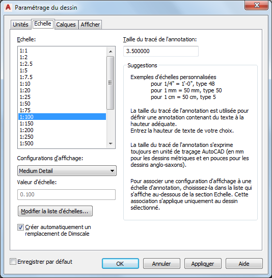 Spécification des options d'échelle par défaut pour le dessin en cours