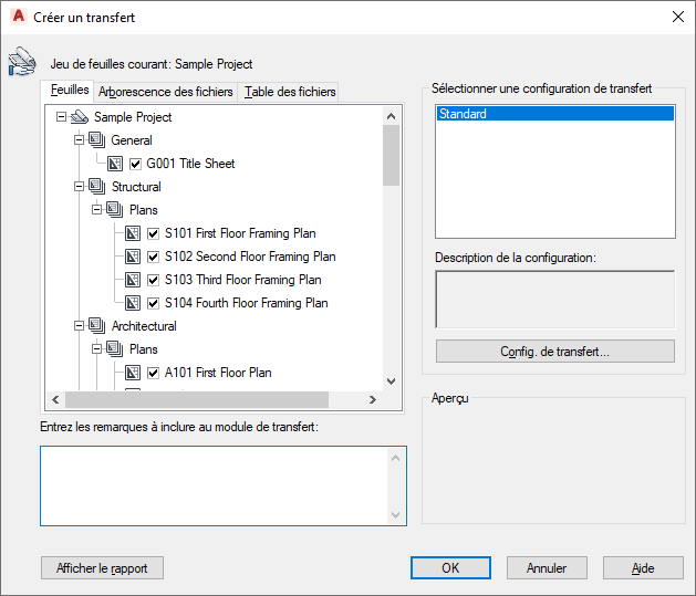 Cette description s'affiche dans la boîte de dialogue Créer un transfert, sous la liste des configurations des fichiers de transfert. Pour consulter la description d'une configuration de transfert, sélectionnez son nom dans la liste.