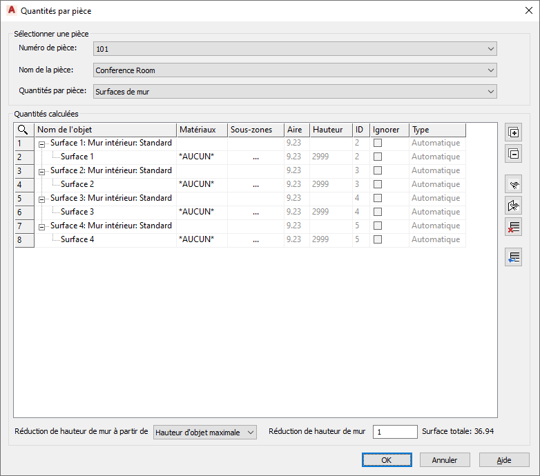 Toutes les surfaces de mur de la pièce sélectionnée sont répertoriées dans la liste. La hauteur est affichée pour chaque objet et chaque face.