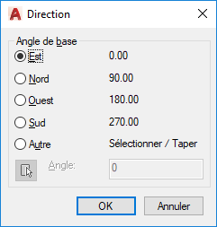 Définit la direction de l'angle zéro. Les options suivantes affectent l'entrée des angles et l'entrée des coordonnées polaires, cylindriques et sphériques.