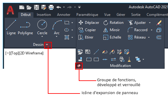 Vous pouvez extraire un groupe de fonctions d'un onglet du ruban et le placer dans la zone de dessin ou sur un autre écran. Le groupe de fonctions flottant reste ouvert jusqu'à ce que vous le replaciez sur le ruban, même si vous passez à un autre onglet du ruban.