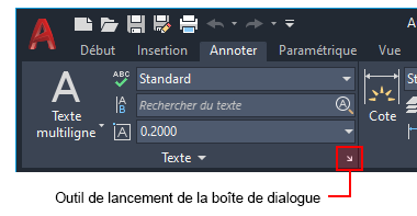 Certains groupes de fonctions du ruban permettent d'accéder à une boîte de dialogue associée. Pour afficher la boîte de dialogue, cliquez sur l'outil de lancement de boîte de dialogue qui est indiqué par une flèche, , dans le coin inférieur droit du groupe de fonctions.