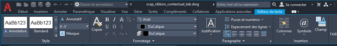 Lorsque vous sélectionnez un certain type d'objet ou exécutez des commandes spécifiques, un onglet de ruban contextuel s'affiche à la place d'une barre d'outils ou d'une boîte de dialogue. L'onglet contextuel se ferme lorsque vous terminez la commande.