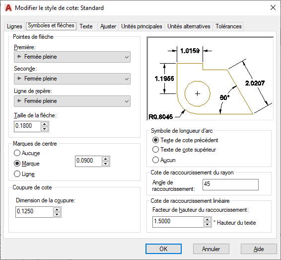 Gère l'affichage du symbole d'arc dans une cote de longueur d'arc (variable système DIMARCSYM)