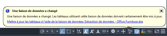Conseil : Si au moins une table dans le dessin contient des données extraites, l'icône liaisons de données est affichée dans la barre d'état de la fenêtre de l'application AutoCAD. Lorsque cette icône est affichée, vous pouvez effectuer un clic droit sur l'icône pour gérer et mettre à jour les liaisons de données dans un dessin. La variable système DATALINKNOTIFY détermine l'aspect et les fonctionnalités de l'icône Liaisons de données.