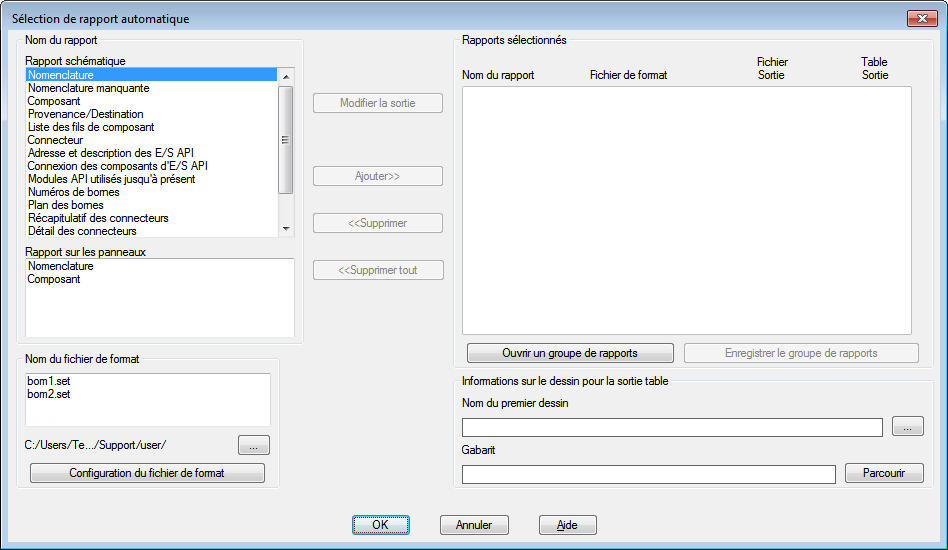 Génère un nombre illimité de fichiers de sortie du rapport et place les tables correspondantes sur les dessins. Vous sélectionnez les rapports et les fichiers de format associés (.set).