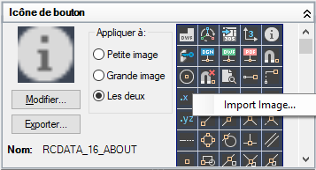 - Dans le volet Icône de bouton, cliquez avec le bouton droit de la souris sur la liste des images et choisissez Importer l'image.