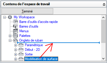 - Dans le volet Contenu de l'espace de travail, cliquez sur le signe plus (+) en regard du nœud Onglets de ruban pour le développer.