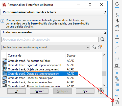 - Dans le volet Liste des commandes, faites glisser la commande que vous voulez ajouter jusqu'à la barre d'outils de votre choix dans le volet Personnalisations dans <nom de fichier>.