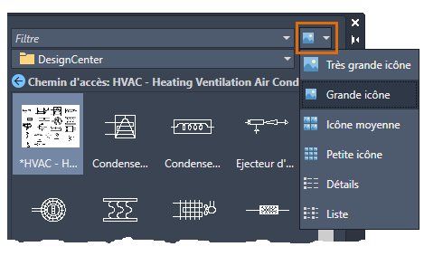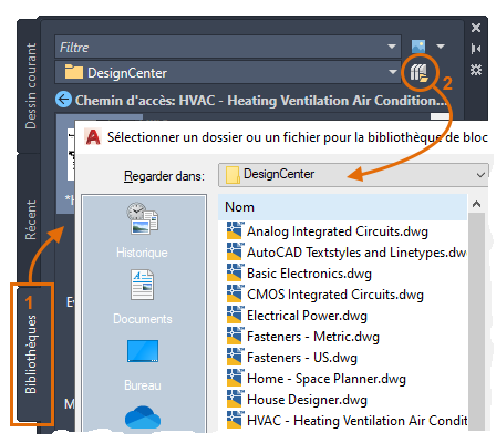 - Pour choisir un autre dessin de bibliothèque dans le dossier DesignCenter, assurez-vous que l’onglet Bibliothèque est activé (1), puis cliquez sur le bouton de navigation de fichiers (2).