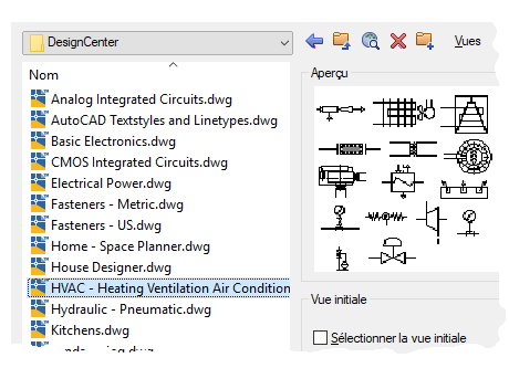 Par exemple, supposons que vous avez créé des dessins pour les systèmes de chauffage, de ventilation et de climatisation. Sélectionnez le dessin de chauffage, ventilation et climatisation et cliquez sur Ouvrir.