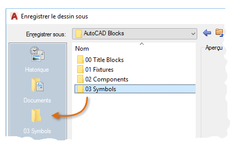 Il est fréquent que des fichiers soient créés pour être utilisés en tant que blocs et enregistrés dans un dossier contenant des fichiers dessin similaires. Vous pouvez utiliser cette méthode au lieu d'avoir à accéder aux définitions de blocs enregistrées dans un seul dessin.
