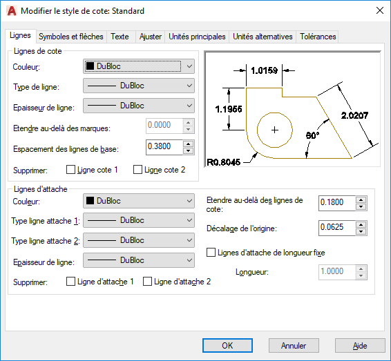 Les styles de cote permettent d'établir et d'appliquer des normes de dessin. De nombreuses variables de cote peuvent être définies à l'aide de la commande COTSTYLE pour contrôler presque chaque nuance de l'aspect et du comportement des cotes. Tous ces paramètres sont stockés dans chaque style de cote.