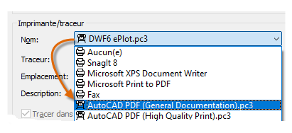 Dans la liste déroulante Imprimante/traceur, choisissez PDF AutoCAD (documentation générale).pc3 :
