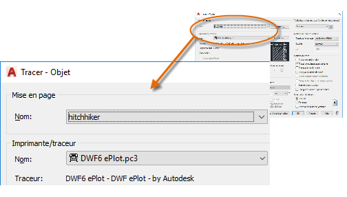 Lorsque vous êtes prêt à effectuer le tracé, il suffit de spécifier le nom de la mise en page dans la boîte de dialogue Tracer pour que tous les paramètres de tracé soient rétablis. Dans l'illustration suivante, la boîte de dialogue Tracer est configurée pour utiliser la mise en page Hitchhiker, ce qui permet de générer un fichier DWF (Design Web Format) au lieu d'effectuer l'impression dans un traceur.
