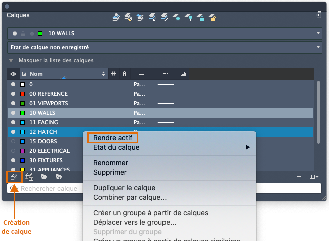 Pour créer un calque, cliquez sur le bouton affiché, puis entrez le nom du nouveau calque. Pour modifier le calque courant, double-cliquez sur son nom ou cliquez avec le bouton droit de la souris sur le nom du calque et choisissez Rendre actif.