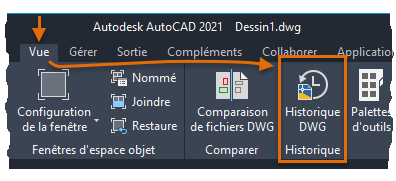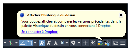 DWGHISTORIQUE : ouvre la palette Historique du dessin, qui affiche un historique des versions du dessin actif tel qu'il est géré par un fournisseur de stockage dans le cloud pris en charge.