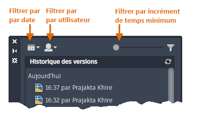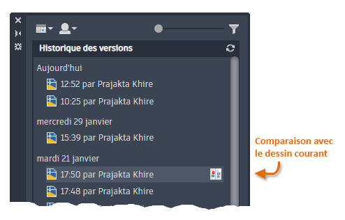 Lorsque vous vous connectez, la palette Historique du dessin s'affiche avec la liste des versions antérieures du dessin.