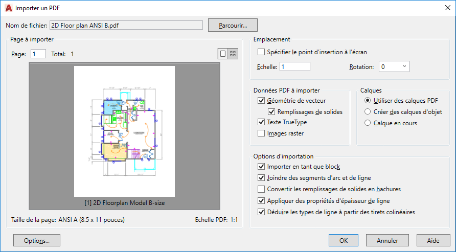 Crée des calques AutoCAD pour tous les types d'objets généraux suivants, importés depuis le fichier PDF : PDF_Geometry, PDF_Solid Fills, PDF_Images et PDF_Text.