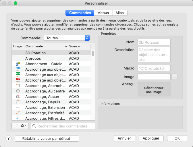 Une commande personnalisée peut être utilisée pour lancer une commande AutoCAD 2021 de base ou une commande définie par un tiers. Les commandes peuvent également contenir le code AutoLISP.
