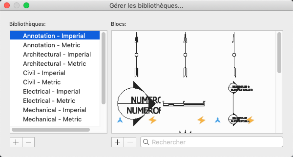 Répertorie les bibliothèques disponibles. Sélectionnez dans la liste des blocs une bibliothèque pour gérer les blocs qu'elle contient. Cliquez deux fois sur le nom d'une bibliothèque pour la renommer.