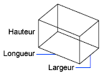 Génère une boîte en fonction de la longueur, de la largeur et de la hauteur que vous indiquez. La longueur correspond à l'axe X , la largeur à l'axe Y , et la hauteur à l'axe Z.