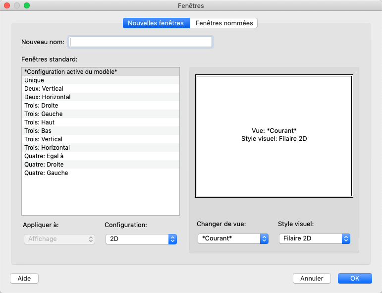 Indique une configuration 2D ou 3D. Si vous sélectionnez l'option 2D, le nouveau fenêtrage est initialement créé avec la vue courante dans toutes les fenêtres. Si vous sélectionnez l'option 3D, un ensemble de vues 3D orthogonales standard est appliqué aux fenêtres de la configuration.