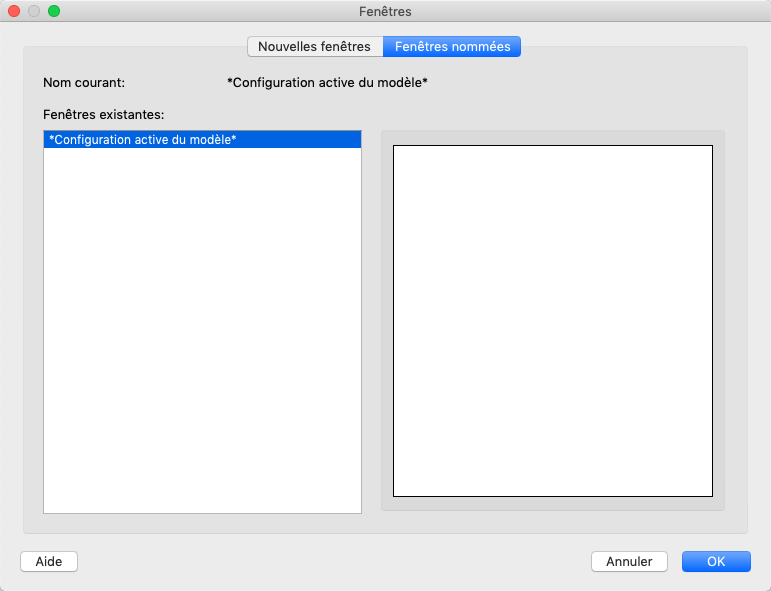 Dans la fenêtre sélectionnée, remplace la vue par celle choisie dans la liste. Vous pouvez choisir une vue existante ou, si vous avez activé la configuration 3D, la sélectionner dans la liste des vues standard. Utilisez la zone d'aperçu pour visualiser les choix.