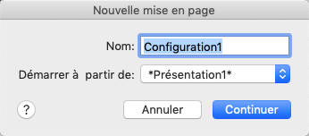 Indique la mise en page à utiliser comme point de départ pour la nouvelle mise en page. Lorsque vous cliquez sur Continuer, la boîte de dialogue Mise en page s'affiche, présentant les paramètres de la mise en page sélectionnée que, au besoin, vous pouvez modifier.