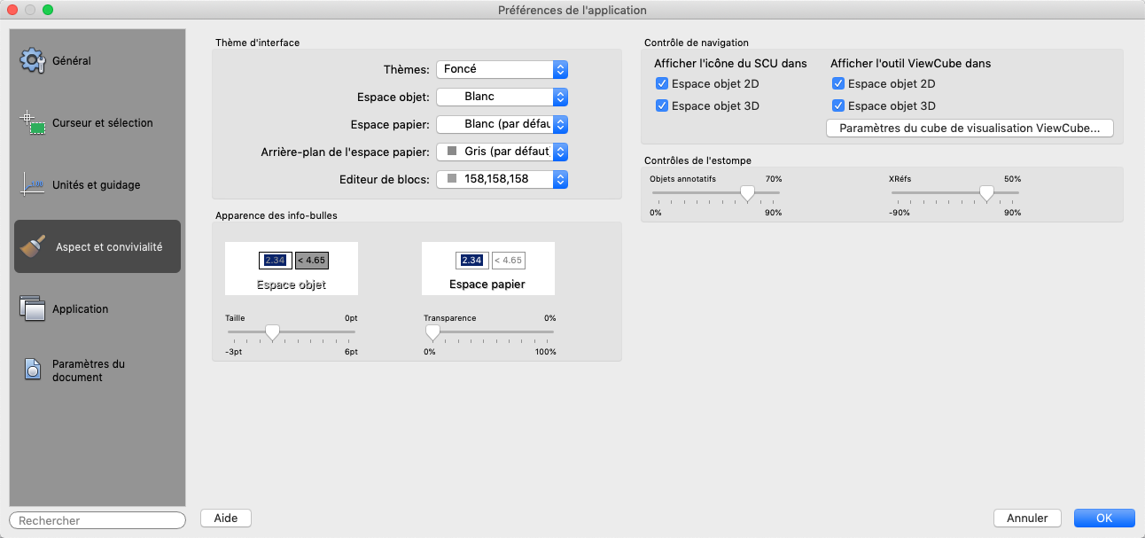 Contrôle le thème à appliquer aux éléments, tels que la barre d'état, les palettes et les fenêtres de dessin. Vous pouvez choisir entre un thème sombre ou clair.