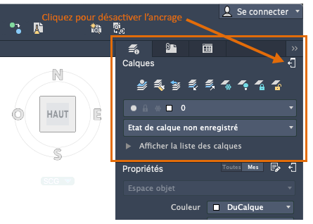 La palette des calques occupe beaucoup d'espace et vous n'avez pas toujours besoin d'accéder à toutes les options. Pour accéder rapidement aux commandes de calque les plus courantes, ancrez la palette des calques. Si aucun objet n'est sélectionné, la palette affiche le nom du calque courant, comme illustré ici.