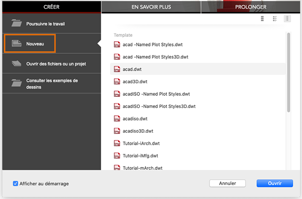 Tous ces paramètres peuvent être enregistrés dans un fichier de gabarit de dessin. Cliquez sur Nouveau pour sélectionner l'un des fichiers de gabarit de dessin proposés :