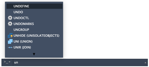 Lorsque vous commencez à saisir une commande, elle est complétée automatiquement. Lorsqu'il existe plusieurs possibilités, comme dans l'exemple ci-dessous, vous pouvez effectuer votre choix en cliquant dessus ou à l'aide des touches fléchées, puis appuyer sur la touche Entrée ou sur la barre d'espace.