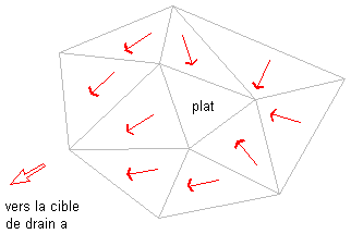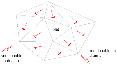 Si certains des triangles opposés non plats descendent à partir de la limite de contour de l'aire plane, mais que tous s'écoulent dans la même cible de drain, l'aire plane fait partie du bassin versant pour la cible de drain “a”, comme représenté dans l'illustration suivante :