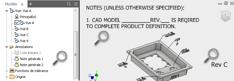 - Activez les vues B, C et D et désactivez la visibilité des notes générales 1 et 2.