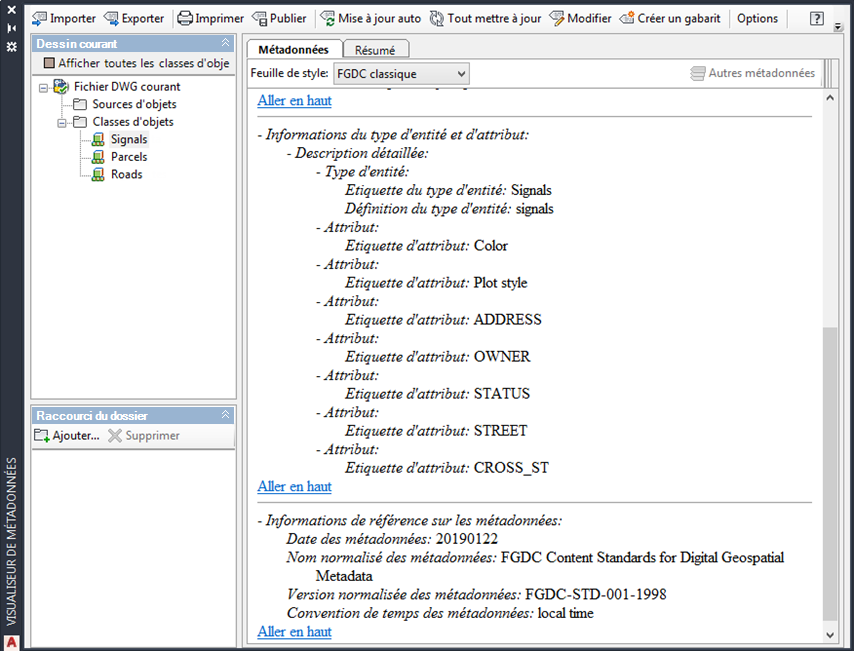 Si un dessin contient des objets classifiés, ses métadonnées sont automatiquement générées et affichées lorsque vous ouvrez le visualiseur de métadonnées pour la première fois.