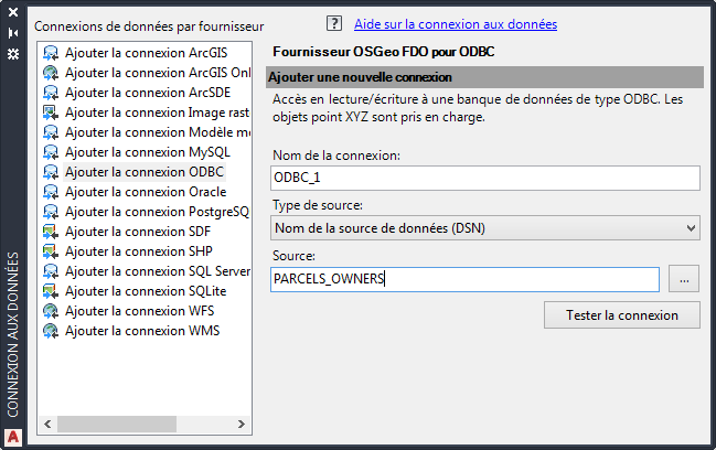 Dans la fenêtre Connexion aux données, spécifiez la nouvelle connexion. N'ajoutez pas à la carte de calque de classe d'objets spécifique à partir de la source ODBC. AutoCAD Map 3D toolset dispose automatiquement de toutes les informations nécessaires lors de la connexion à la source ODBC.