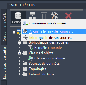 4. Dans l'onglet Explorateur de cartes du volet Tâches, cliquez sur DonnéesAssocier les dessins source.