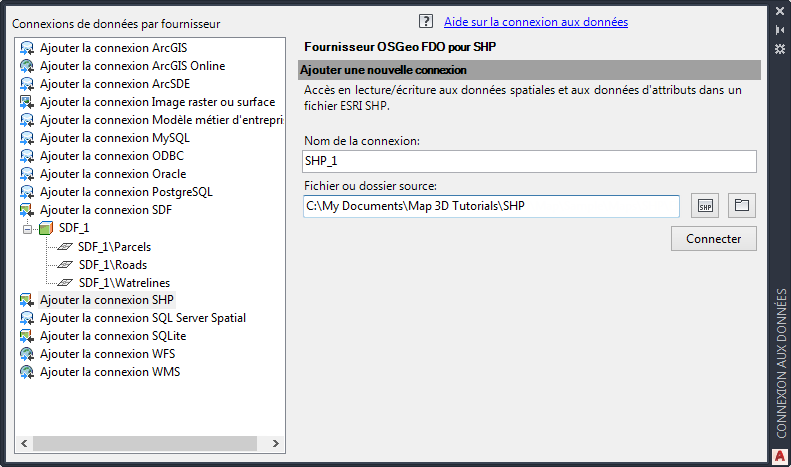 Vous allez créer un nouveau dossier vide dans lequel vous placerez les fichiers SHP. Pour convertir et copier des données au format SHP, vous devez être connecté à ce dossier. Utilisez Connexion aux données pour établir des connexions avec les banques de données, même si vous n'ajoutez aucune donnée de la banque de données à la carte.