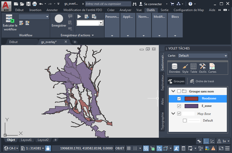 Il enregistre la carte courante sous la forme d'un fichier DWG (en convertissant tous les objets en objets de dessin). Il enregistre ensuite chaque calque du·gestionnaire d'affichage dans un fichier .layer qui peut être partagé avec d'autres utilisateurs d'AutoCAD Map 3D toolset ou qui peut être chargé dans Autodesk Infrastructure Map Server .