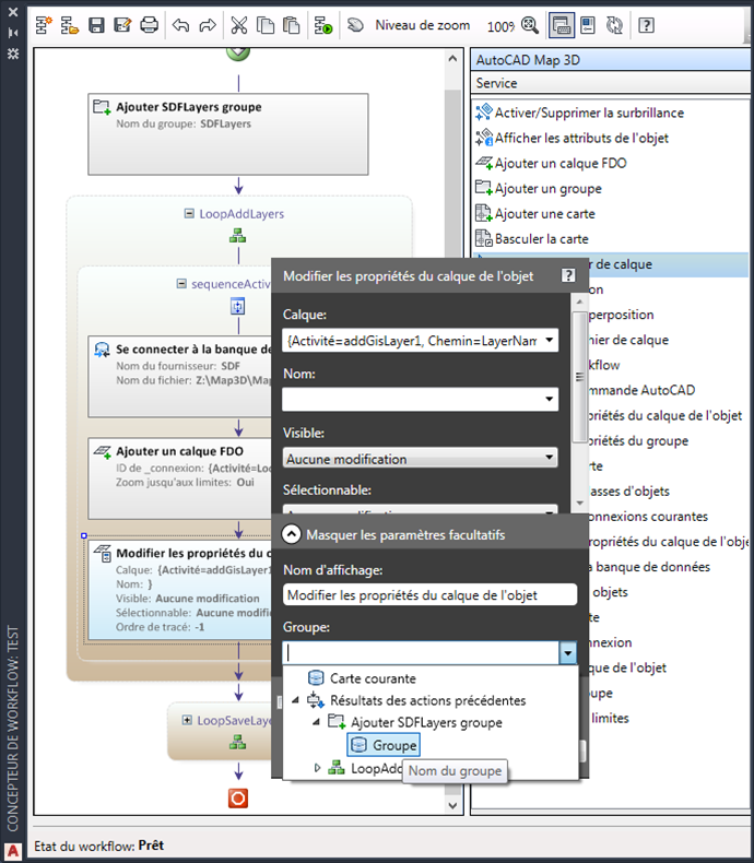 Etant donné que vous voulez changer la propriété Groupe de chaque calque que vous ajoutez, placez cette activité à l'intérieur de l'activité ForEach appelée "LoopAddLayers".