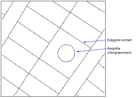 Les polygones sont traités comme des surfaces réelles et pas seulement comme des limites. Dans l'exemple suivant, la zone du polygone traverse la limite spécifiée par la requête de sorte que l'ensemble du polygone est extrait bien qu'aucun des objets qui le constituent ne traverse une partie quelconque de la limite spécifiée par la requête.
